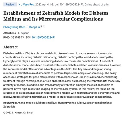 一、糖尿病(DM)是一种慢性代谢性疾病,可引起多种微血管并发症,高血糖在糖尿病微血管并发症的发生中起着关键作用,建立糖尿病动物模型是常用的研究策略。斑马鱼微小的体型和庞大的后代数量使其能够进行大规模的分析或筛选,我们对利用斑马鱼建立糖尿病或高血糖模型的策略,及以斑马鱼为模型研究糖尿病微血管并发症的优缺点进行了综述,并于2022年4月发表在《Journal of Vascular Research》。