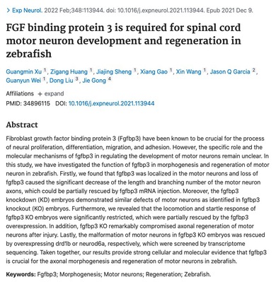 八、研究发现,Fgfbp3定位于运动神经元,其缺失导致了运动神经元轴突长度和分支数量的显著减少,敲除或敲低该基因的表型一致均引起运动神经元的缺陷,行为反应敏感度也显著降低。此外,敲除Fgfbp3对于损失后运动神经元轴突再生起抑制作用。研究表明,Fgfbp3在斑马鱼运动神经元的轴突形态发生和再生过程中起着重要的作用。相应研究成果于2022年2月发表在《Experimental Neurology》。