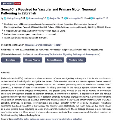 二、semaphin4c (sema4C)是第4类信号素的一员,研究发现sema4C在斑马鱼胚胎神经系统和节段间血管(ISVs)中均有表达,sema4C基因的敲除导致斑马鱼胚胎的isv和初级运动神经元(PMNs)出现严重的寻路异常,表明sema4C是调节血管和神经元发育的双重指导因子。相关研究成果于2022年6月发表在《Cells》。