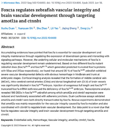 三、大量的研究表明foxc1a通过调控下游基因的表达和与信号通路的相互作用对血管发育和完整性的维持非常重要,然而foxc1a在调控血管发育中的潜在细胞和分子机制还需进一步研究。我们利用斑马鱼研究发现foxc1a通过靶向amotl2a和ctnnb1调节血管完整性和脑血管发育。相关研究成果于2022年9月发表在《Microvasc Res》。