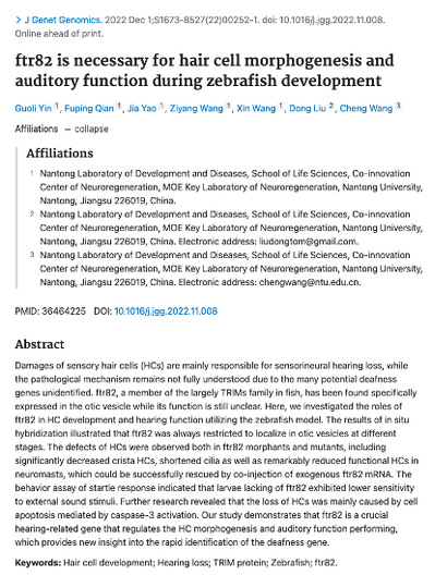四、感音神经性听力损失的主要原因是感觉毛细胞的损伤,但由于许多潜在的耳聋基因尚不明确,其病理机制尚不完全清楚。ftr82是鱼类中主要TRIMs家族的一员,已发现在小囊泡中特异性表达,但其功能尚不清楚。我们利用斑马鱼模型研究了ftr82在毛细胞发育和听力功能中的作用。结果表明,ftr82是一个重要的听力相关基因,调控HC形态发生和听力功能的发挥。相关研究成果于2022年12月发表在《J Genet Genomics》。