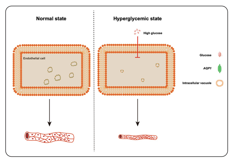 高血糖引发的微血管并发症,包括出血、微动脉瘤、毛细血管无灌注和新血管形成等,是糖尿病高发病率和死亡率的主要推动因素。尽管糖尿病的主要治疗策略依赖于血糖控制,但针对导致微血管并发症的基础因素的治疗同样至关重要。在高血糖背景下,血管直径的减小是一个普遍存在的现象,这会导致血液供应不足并加剧血管功能障碍。在血管发育过程中,依赖于内皮细胞胞内囊泡融合是形成血管管腔的一种重要方式。水通道蛋白(AQPs)是一类四聚体膜蛋白超家族,其主要生理作用是调控水以及其它小分子如甘油的跨膜转运。AQP1主要表达于微血管内皮细胞,可通过驱动水分子的跨膜转运影响板状伪足延伸,进而影响内皮细胞的迁移。然而,内皮细胞特异表达的水通道蛋白是否参与血管管腔的形成尚不清楚。该研究团队通过分析糖尿病视网膜病变病人视网膜组织样本特点,结合单细胞和转录组测序手段发现,糖尿病视网膜病变病人的视网膜微血管显著变细,且血管管腔直径与AQP1的表达呈负相关。随后,利用斑马鱼动物模型以及体外培养的血管内皮细胞结合遗传学和分子生物学实验手段阐明了内皮细胞表达的水通道蛋白APQ1参与血管管腔形成的新机制。本研究为基因治疗糖尿病微血管病变提供了全新的治疗靶点,同时团队也申请了相关发明专利。