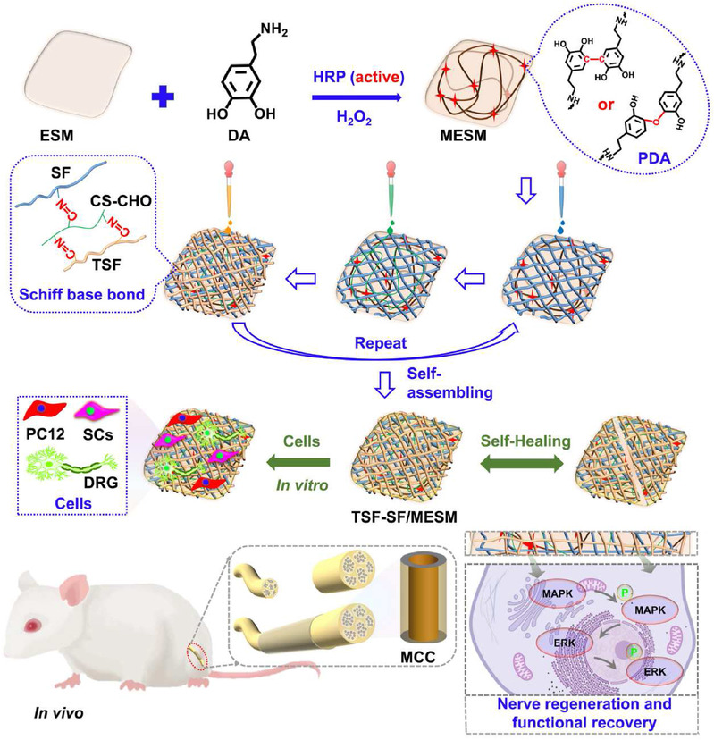 周围神经损伤是一种全球性临床疾病,严重影响人类的健康与生活。目前,自体神经移植和人工神经支架是治疗周围神经缺损的有效方法,但仍面临供体移植物来源有限、尺寸不匹配、术后功能障碍、再生能力差以及二次手术风险等诸多限制。这些问题制约了周围神经损伤的有效修复。人工神经导管能够提供机械支持,引导雪旺细胞的迁移,并促进轴突的延伸,从而有助于神经再生。尽管天然神经支架在研究中广受关注,但其机械性能差、稳定性不足以及无法有效促进细胞增殖和分化等局限性,限制了其在神经再生领域的实际应用。为此,本文基于层层自组装技术,设计了一种多功能蛋壳膜-丝素神经支架。蛋壳膜的引入及其自修复性能显著改善了纯桑蚕丝素神经支架的力学性能、稳定性和生物相容性。此外,支架内丰富的RGD三肽序列有效促进了RSC96细胞的增殖和PC12细胞的轴突延伸。转录组分析结果表明,PI3K-AKT通路的激活在神经再生过程中起着调节作用,为修复周围神经缺损提供了新的理论和实验依据。