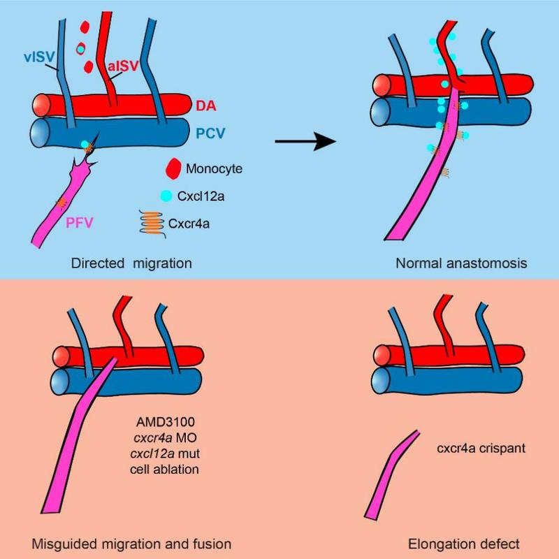 该团队借助活体成像技术,阐释了胸鳍血管的发育过程,并发现胸鳍血管动脉分支(PFVc)会历经长距离迁移,精准地与第二对节间血管吻合。探究其分子机制,研究人员发现cxcl12a-cxcr4a信号轴在其中起着核心作用。通过单细胞转录组测序、原位杂交等技术手段发现趋化因子受体cxcr4a在发育中的胸鳍血管内皮细胞有较高表达,而没有检测到其他受体的显著表达。原位杂交筛选发现其配体cxcl12a则在第二对节间血管附近特异性高表达。抑制或过表达该信号轴相关基因,均导致PFVc生长方向异常,并形成错误连接,证实了其关键引导作用。进一步通过单细胞转录组测序的数据分析、细胞消融、荧光原位杂交等实验数据表明,一群表达gata1a的单核细胞是cxcl12a的主要来源。该群单核细胞分泌的cxcl12a,引导着血管的迁移和吻合。该研究发现了器官血管化过程中一种长距离的血管迁移和吻合过程,首次明确了单核细胞来源的Cxcl12a-Cxcr4在血管定向迁移和吻合中的关键作用,为脊椎动物器官特异性血管化机制的研究提供了全新的细胞生物学机制。