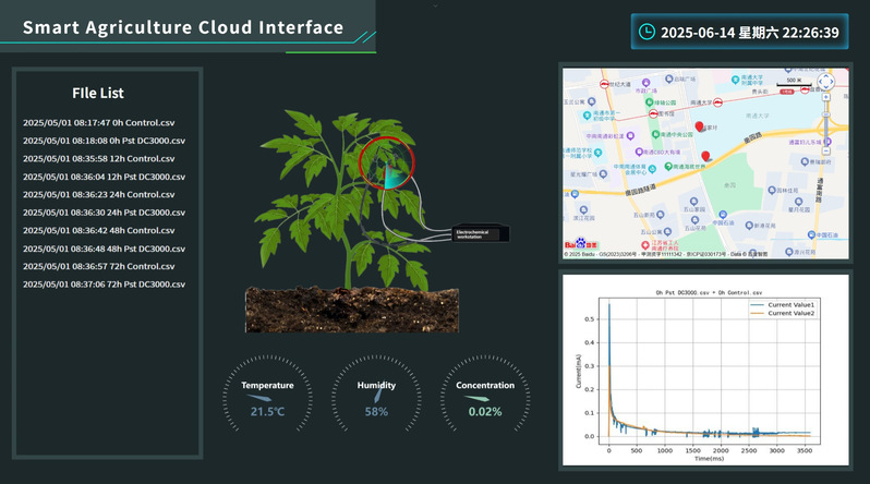 该研究开发了一种基于智能手机的电化学微传感器系统,并结合物联网技术,实现了对植物体内水杨酸的远程实时监测。水杨酸是植物健康的"晴雨表"。传统检测方法如色谱分析需要复杂的样品前处理,无法实现田间实时监测以及数据的远程传输。研究团队首次将智能手机电化学检测技术拓展至植物激素信号监测领域,创造性地将微型三电极传感器、智能手机的移动计算和传输能力与物联网(IoT)技术相结合,构建了一套完整的水杨酸远程监测系统,具有便携性(传感器直径仅头发丝粗细)、实时性(无需样品预处理)和智能化(数据云端共享)三大优势。该技术框架还可扩展至其他植物激素如茉莉酸、脱落酸等的监测,为构建基于植物信号分子的早期预警系统奠定了基础。未来通过优化传感器阵列,有望实现对多种植物激素的同步监测,推动智慧农业从"表型观察"向"分子预警"的跨越式发展。