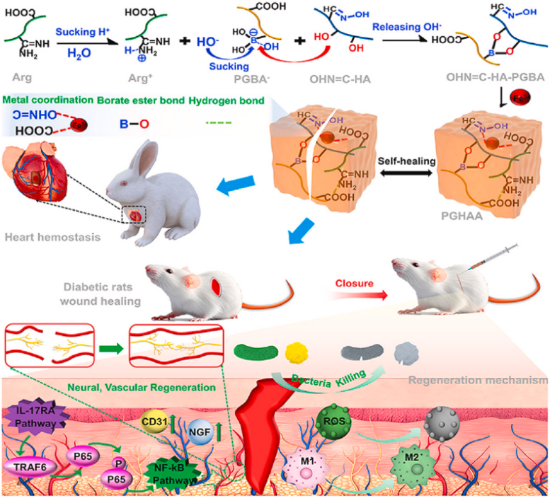 研究团队从桃树胶中提取桃胶多糖,并首次将其作为仿生材料应用于糖尿病组织缺损修复,其中巧妙利用了精氨酸生物活性小分子,结合分子动力学模拟、转录组测序等技术手段,发现该水凝胶具有强效组织黏附,无需手术缝合,同时,激活IL-17/NF-κB信号通路,上调IL-17RA、TRAF6及磷酸化P65表达,促进伤口部位组织、血管和神经再生,彻底实现糖尿病慢性伤口的愈合,较传统治疗手段大幅缩短愈合周期。